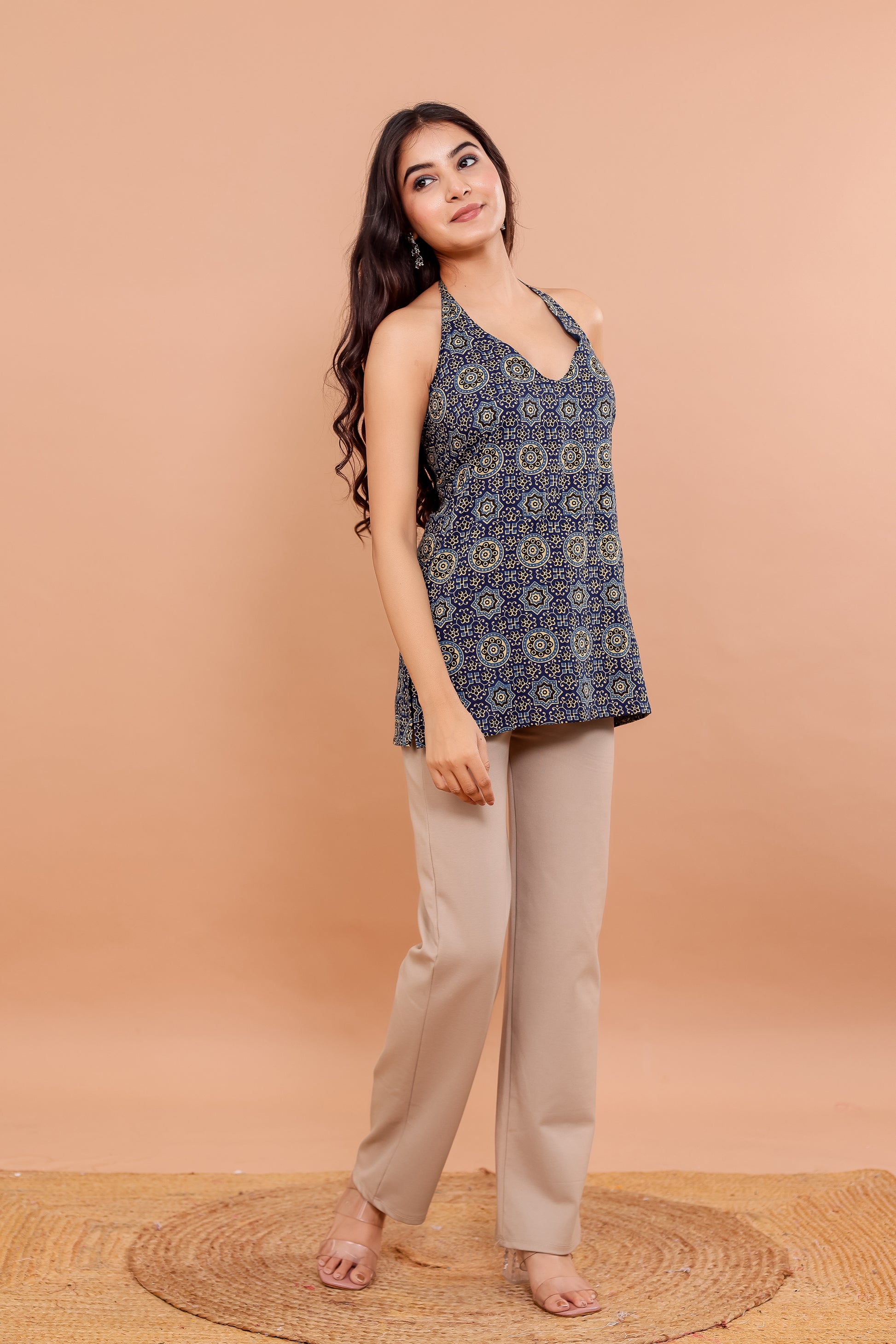 Level up your ethnic-cool game with the Saanjh Indigo Halter Neck Kurti – a fresh take on desi meets boho. Featuring trippy mandala prints and a bold halter neckline, this cotton kurti is made for summer slay. Pair it with cargos, flares, or wear it solo – it’s giving main character energy.