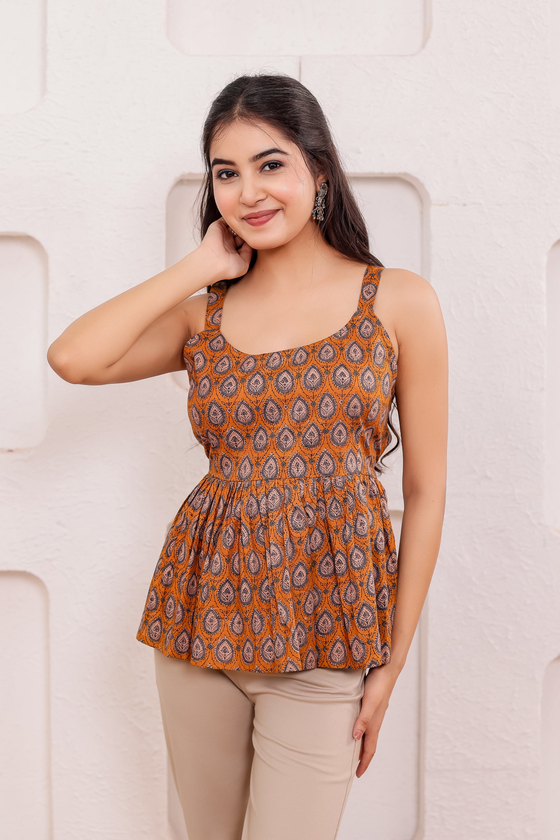 The Mahi Mustard Flare Peplum Top is your new sunny-day bestie. Designed in earthy mustard tones with block-inspired prints, it flares just right at the waist for that snatched, breezy silhouette. Pair it with jeans, trousers, or skirts—it’s giving effortlessly cute with a desi-core twist.