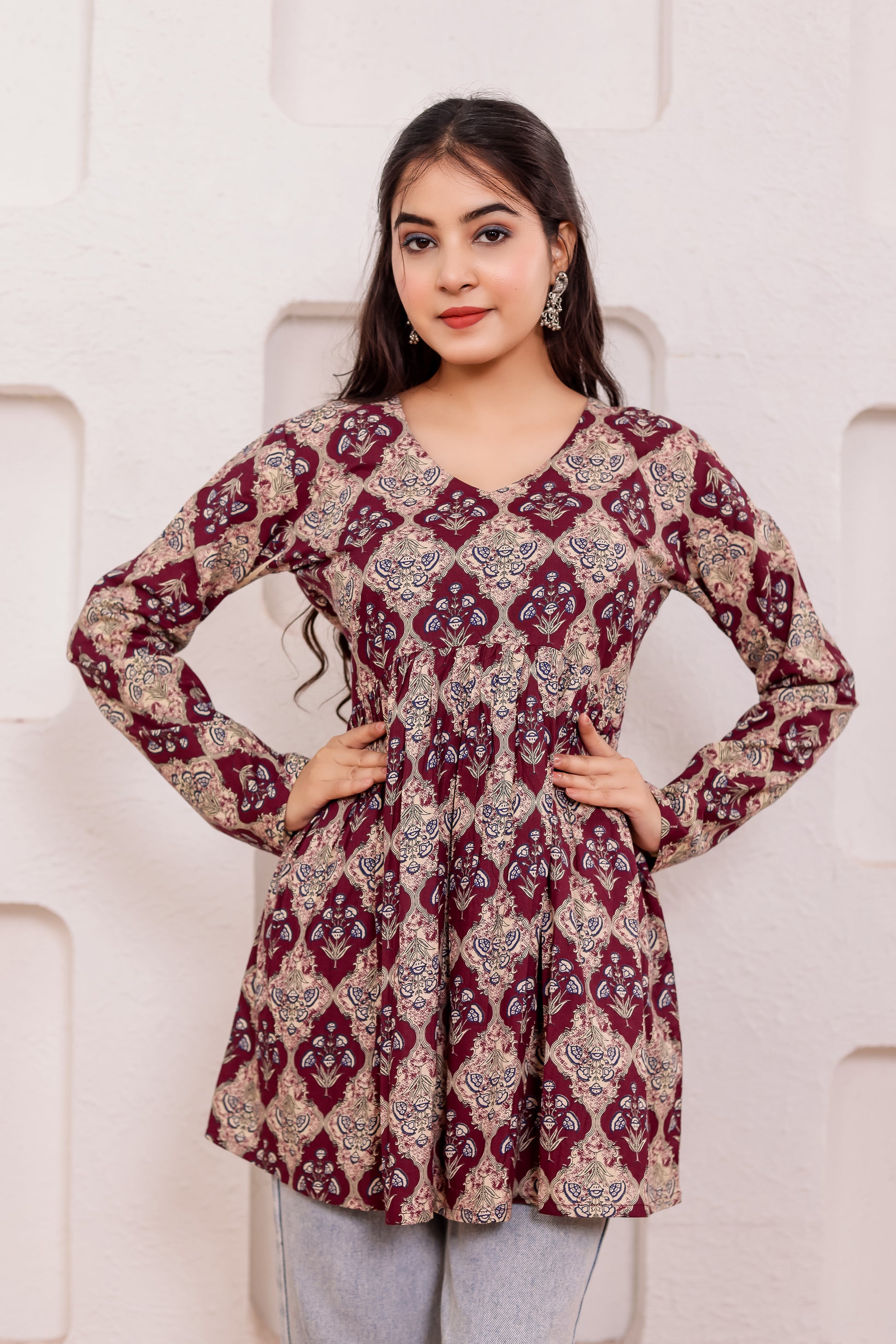 Vintage desi meets modern chic with the Myra Kurti. A maroon & beige blockprint beauty with an empire waist that flatters and flows — it's the throw-on-and-wow piece your closet’s been waiting for.