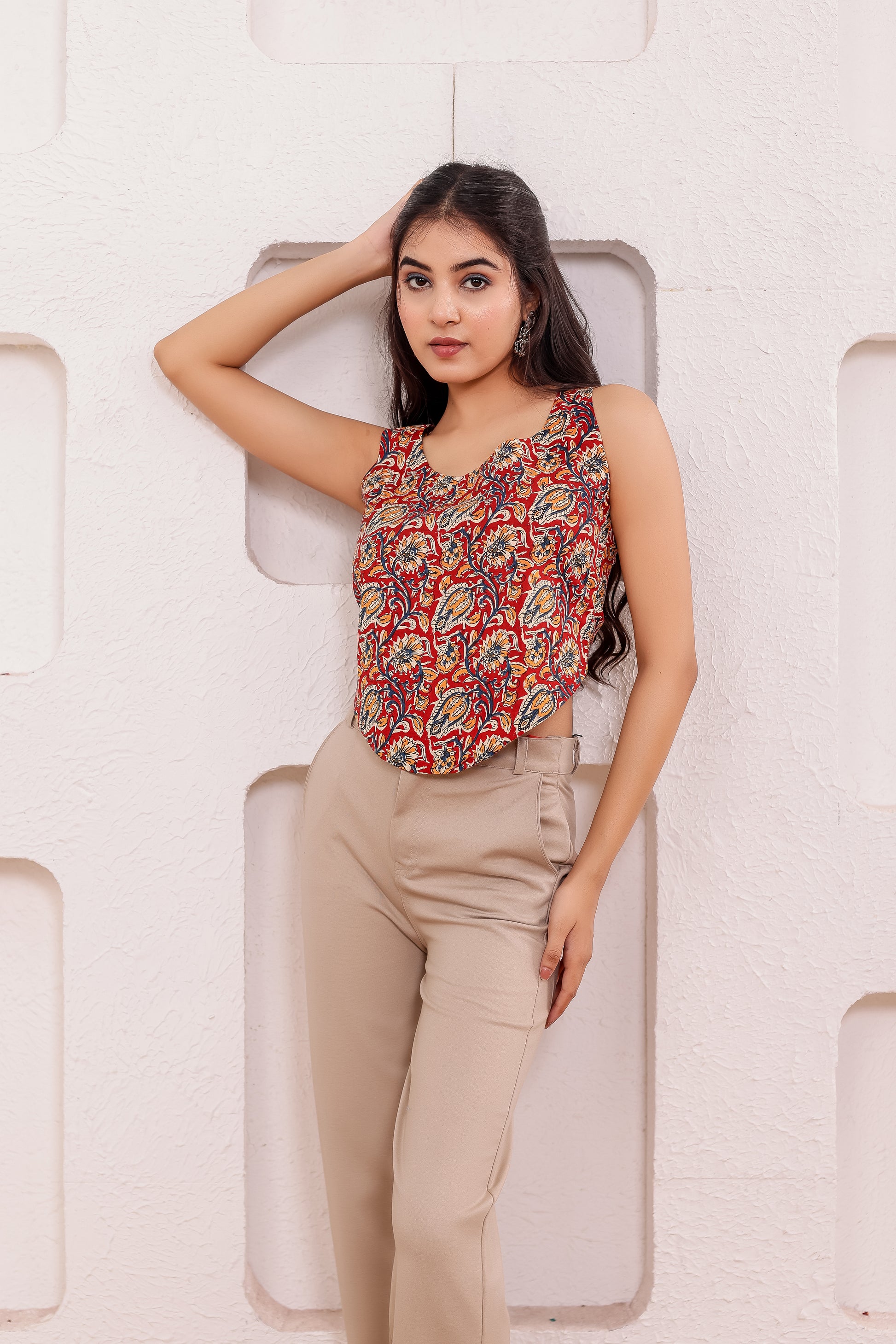 Say hello to your next fit check favorite—the Rhea Red Paisley Top. With its sharp asymmetric hem, bold paisley print, and crop-fit energy, this cotton sleeveless top is here to serve desi-meets-streetwear realness. Style it with cargos, denim, or layer it with a shrug—it’s giving hot girl summer.