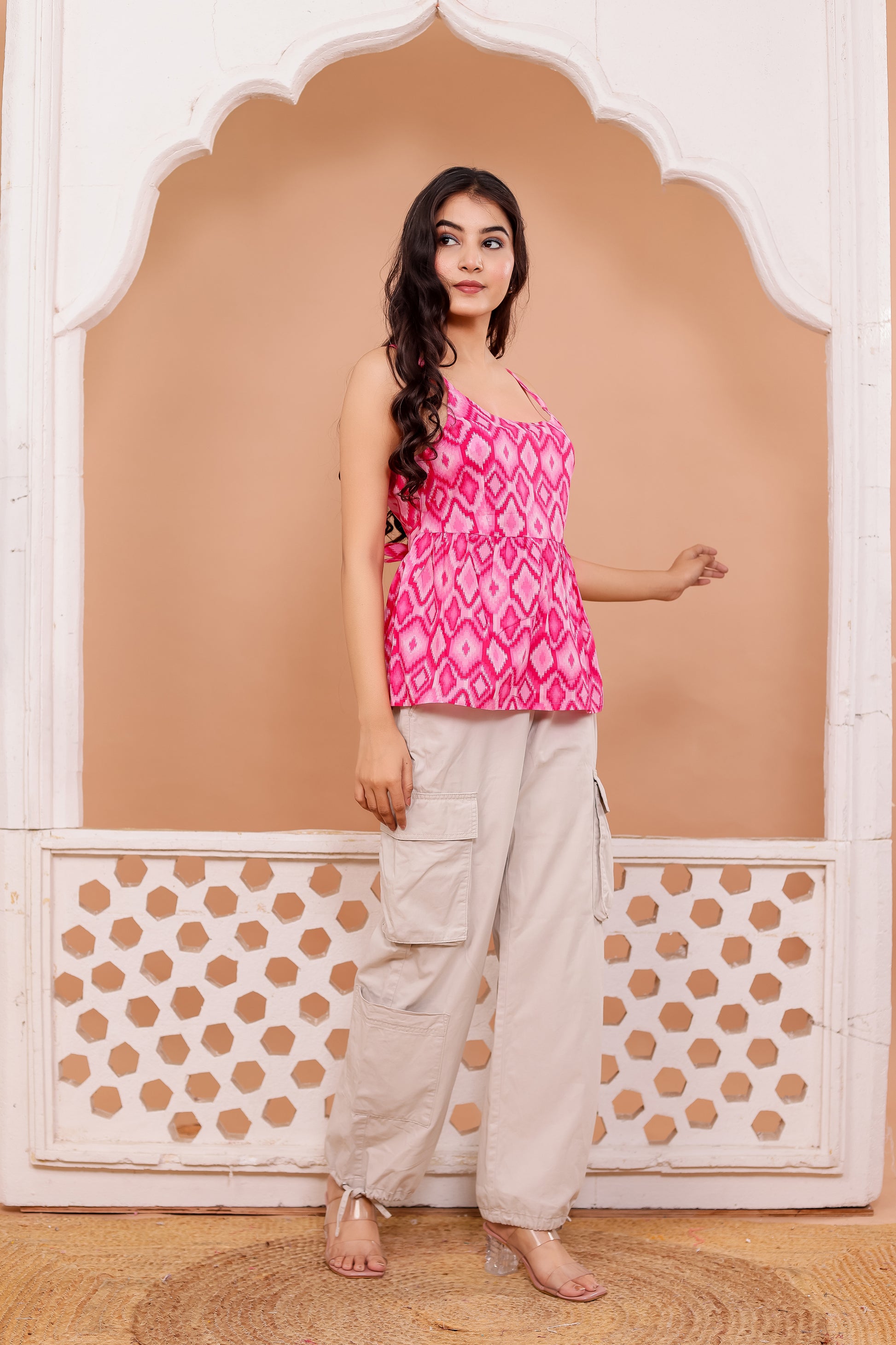 Step into effortless charm with Kiyana, a sleeveless cotton top that blends comfort with bold prints. Featuring a square neckline and a vibrant pink Ikat pattern, this piece flatters every curve with its gathered waistline and breezy silhouette.